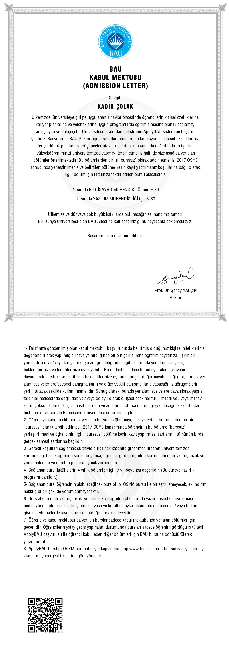 2017-18 eğitim öğretim sezonu için Bahçeşehir Üniversitsi ApplyBau uygulamasına katılarak Bilgisayar ve Yazılım Mühendisliği bölümleri adına kendi hayallerimi ve yeteneklerimi tanıtarak başvuruda bulundum. Başvurumun sonucunda iki bölüm için de %30 burs olanağı sağlandı.